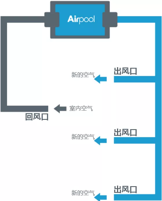 双向流新风系统:对单向流新风系统有效的补充,增加了排风管道系统,排风和送风可以同时进行。新风主机通过管道与室内的空气分布器相连接,新风主机不断的把室外新风通过管道送入室内,以满足人们日常生活所需新鲜、有质量的空气,同时将室内的污浊空气一并排出室外,在室内空间形成一个空气循环。